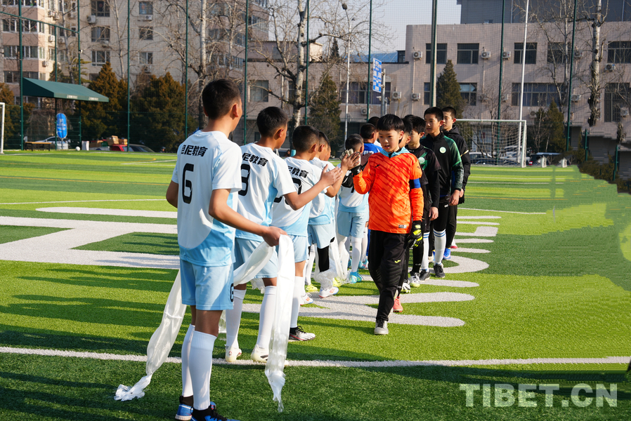 2025年12月29日,京藏少年開展足球聯(lián)誼賽,賽前擊掌,西藏青少年向?qū)Ψ角騿T獻哈達。攝影:宋俊