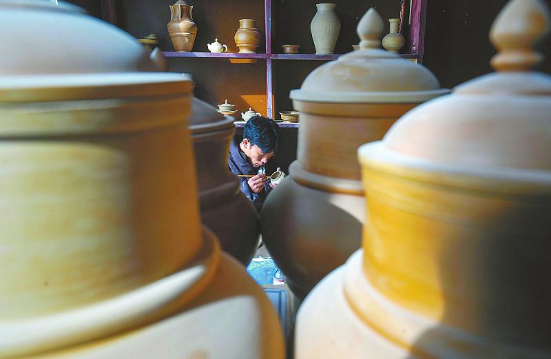 12月的冬日陽(yáng)光透過壤巴拉藏式陶藝傳習(xí)所的窗口,在飛轉(zhuǎn)的泥坯上折射出金色的光芒。在四川省阿壩藏族羌族自治州壤塘縣上壤塘鄉(xiāng)仁棚村的這間陶藝傳習(xí)所,澤郎斯加正在陶器原型上修坯。澤郎斯加和傳習(xí)所的18名學(xué)員,都來自于壤塘縣貧困牧民家庭,經(jīng)過六年的學(xué)習(xí)和進(jìn)修,他們?cè)谔账噦髁?xí)所已熟練掌握了藏陶的拉坯、修坯、燒制等綜合技藝,并完成了德育、藏文、漢語、數(shù)學(xué)、電子商務(wù)、藏漢文書法、基礎(chǔ)繪畫等課程培訓(xùn)。