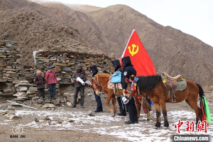 圖為馬背巡邏隊在轄區(qū)內(nèi)為牧民贈送口罩、發(fā)放藏漢雙語宣傳資料?!≡魈m周 攝