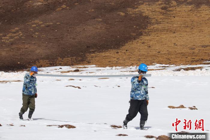 青海省玉樹藏族自治州稱多縣境內(nèi)的覺頂山山頂海拔5310米,“三區(qū)兩州”玉樹地區(qū)電網(wǎng)工程建設(shè)稱多110千伏輸變電二回線路將在這里組立一基鐵塔。4月10日,天剛蒙蒙亮,項目負責人韓建青便帶著施工隊徒步趕向位于半山腰的塔基處。積雪已經(jīng)淹沒了腳踝,一腳踩下去,能清晰的感受到冰雪觸及皮膚帶來的刺痛?!耙氲竭_塔基處可不容易啊,看到我們背的鐵鍬了嗎,那不是挖地的,那是開路用的?!蹦杲?0歲的韓建青氣喘吁吁地說。