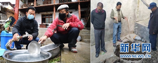 拼版照片:左圖為4月21日,勒阿村駐村第一書記張金利(左)在村民屠海榮家查看自來水管情況(新華社記者陳斌攝);右圖為2019年10月18日,張金利(中)指導(dǎo)村民挖自來水防凍井(新華社發(fā))。