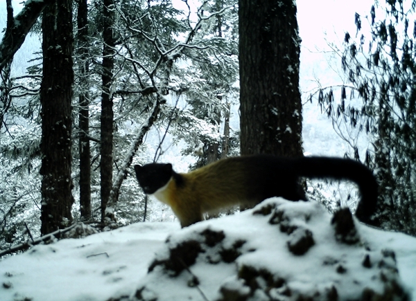 此次拍攝到的視頻資料顯示,在保護(hù)區(qū)多個點位都有大熊貓活動的身影,并且出現(xiàn)了多次,其中在同一區(qū)域,兩次拍到大熊貓嗅味樹標(biāo)記行為;在同一點位同時拍攝到大熊貓、川金絲猴、金貓、黃喉貂、黑熊、毛冠鹿、野豬、豪豬等8種動物活動影像。此外,保護(hù)區(qū)還首次拍攝到金貓活動影像。