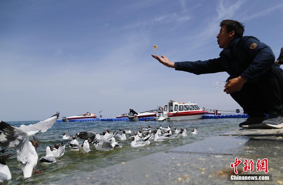 5月19日,一位游客在青海湖二郎劍景區(qū)內(nèi)給水鳥喂食。當(dāng)日是中國旅游日,游客在青海省海南藏族自治州青海湖二郎劍景區(qū)內(nèi)乘船觀湖、與水鳥互動(dòng)、感受初夏青海湖的海天一色之美。中新社記者 馬銘言 攝