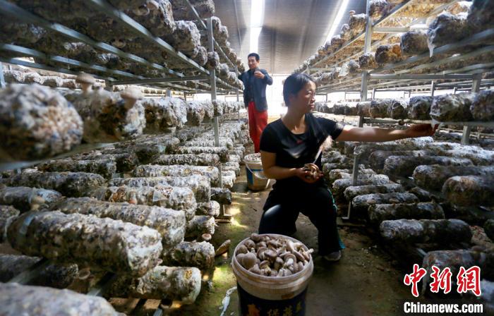 “香菇夫妻”王世芳和丈夫萬(wàn)銀成正采摘香菇。高展 攝