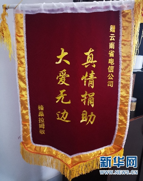 2019年9月,格桑拉姆將書有“真情捐助 大愛無邊”字樣的錦旗,送到前來燕門鄉(xiāng)調(diào)研的中國電信云南公司黨委書記、總經(jīng)理王宏手上,以表達自己的感激之情。