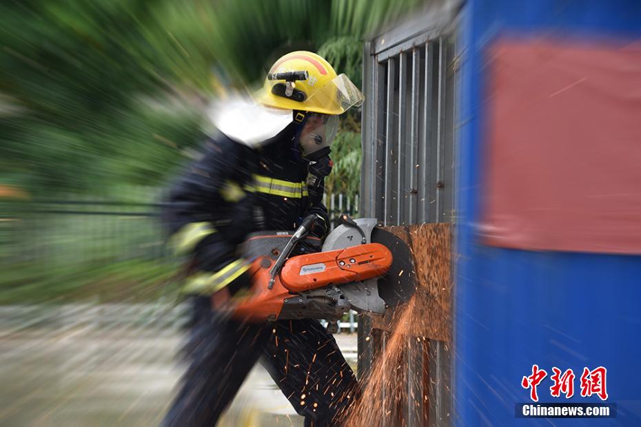 圖為消防員利用無齒鋸對(duì)障礙物進(jìn)行破拆。 婁淵燾 攝