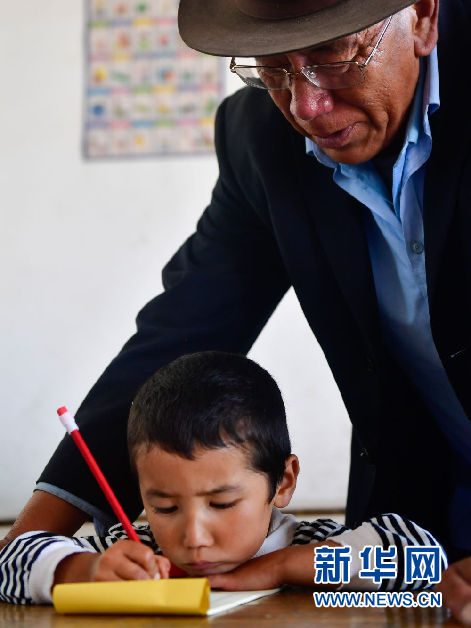 8月31日,在來塘村學(xué)校,完么仁增老師在指導(dǎo)一年級學(xué)生馬文輝學(xué)習(xí)。新華社記者 張龍 攝