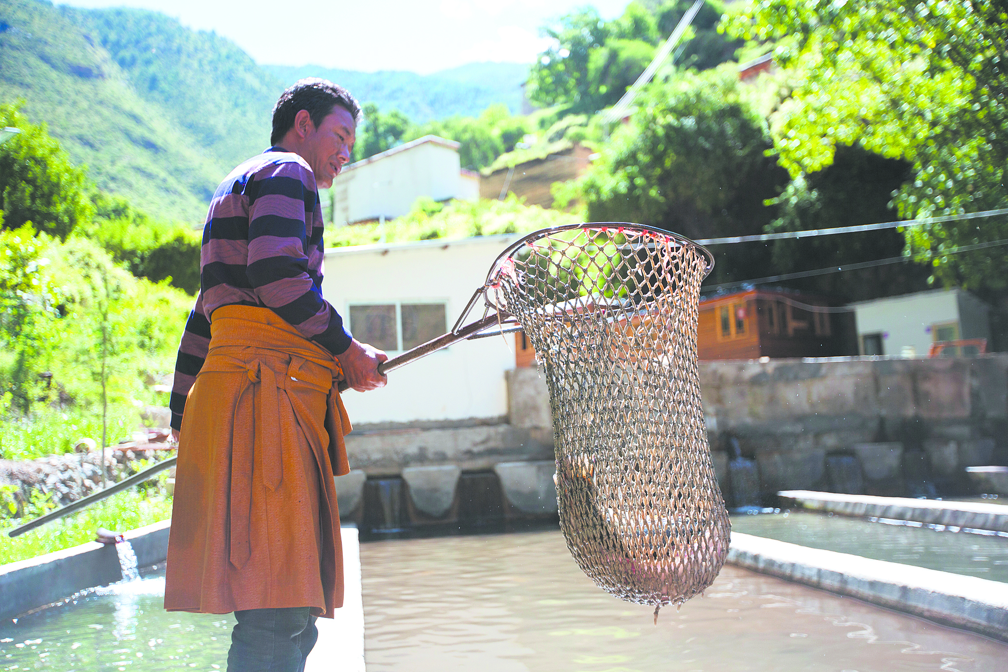 在成品魚池前,38歲的藏族老鄉(xiāng)彭錯正拿著網(wǎng)兜撈魚。今天有買家來看魚,他負責撈幾條樣品給人看。用攔截網(wǎng)片把魚群逼到狹窄的水道內(nèi),彭錯熟練地拿起網(wǎng)兜在水中一攪,兩條肥碩的裂腹魚從水塘中一躍而起,褐色的鱗片在陽光下閃閃發(fā)光。彭錯不慌不忙,牢牢把住網(wǎng)兜左右一揮,兩條大魚便被捕入網(wǎng)中。“至少有三四斤重,肉質(zhì)緊實,品質(zhì)很不錯!”趕來查看的買家一邊抓魚一邊夸贊。