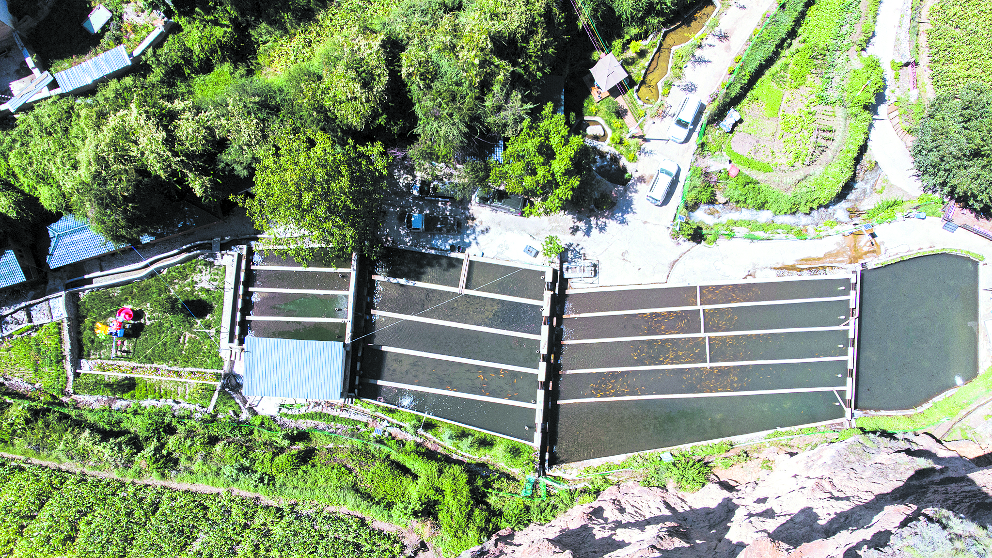 采訪車沿215國道在山谷間蜿蜒,定曲河水碧藍清亮。從莫木溝一路翻山而上,快到山頂時,一座高山冷水魚養(yǎng)殖魚場呈現(xiàn)眼前。