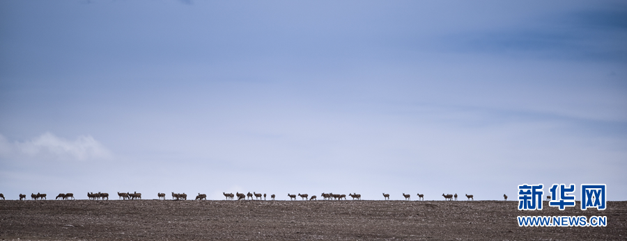 青海可可西里地區(qū),一群雌性待產(chǎn)藏羚羊通過青藏公路后向卓乃湖行進(2016年6月7日攝)。新華社記者 吳剛 攝