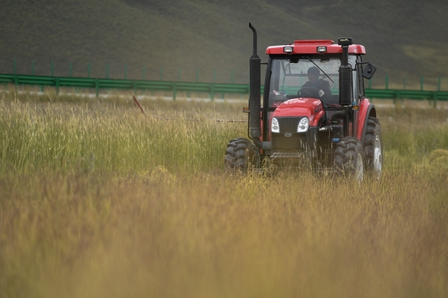格多村村民藏木改駕駛收割機收割飼草種植基地的黑麥。新華網(wǎng) 潘彬彬 攝