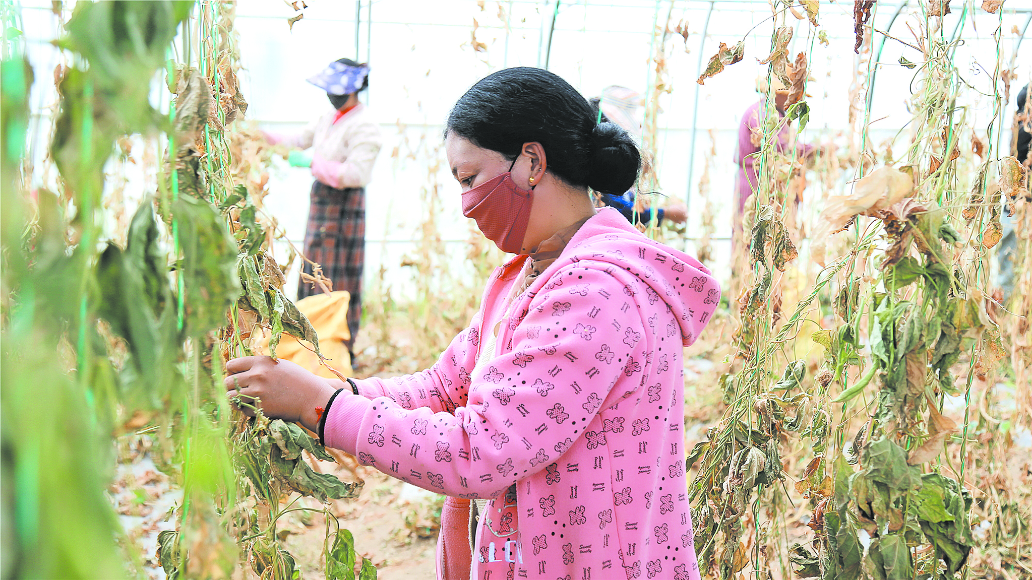正是收獲時(shí)節(jié),在種植無筋豆種的大棚里,根窮卓瑪和其他村民正把成熟后已經(jīng)枯黃的無筋豆莢從藤上摘下來。