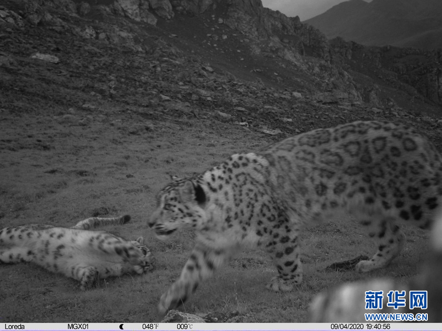這是9月4日在祁連山東端的青海省海東市互助土族自治縣北山林場拍攝到的雪豹母子玩耍嬉戲的影像。新華社發(fā)