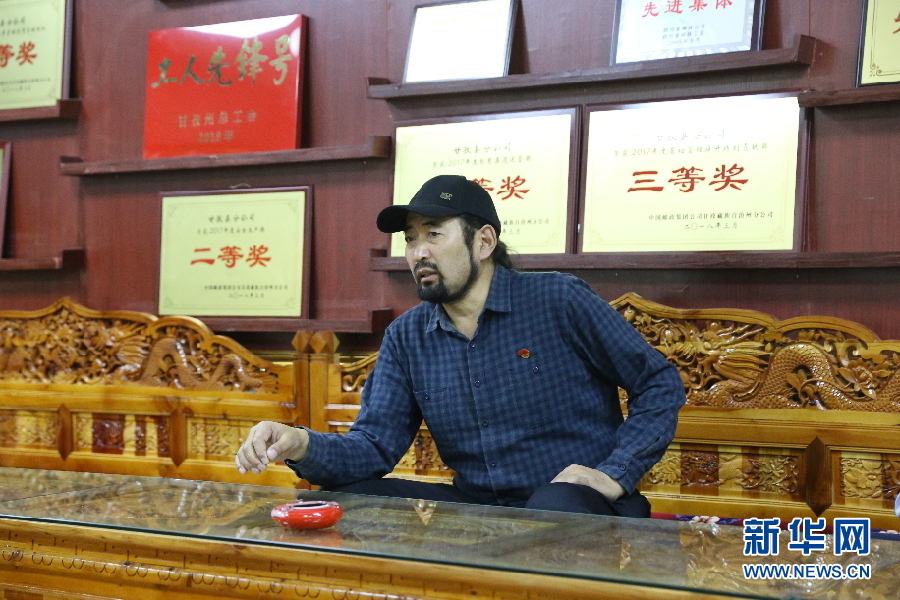 其美多吉接受采訪,背后的墻上掛滿他和集體的各項(xiàng)榮譽(yù)。新華網(wǎng) 曹鵬 攝