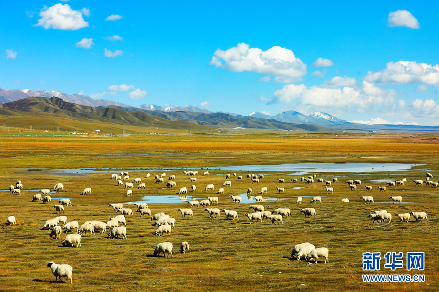 藍天白云之下,羊群悠閑自在地吃著草,與草原相映成趣。新華網 蘇金元 攝