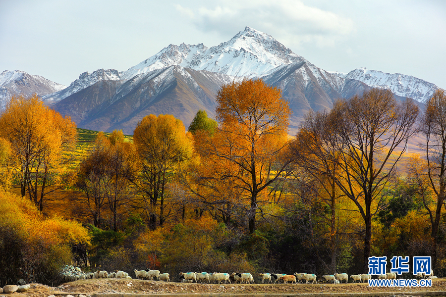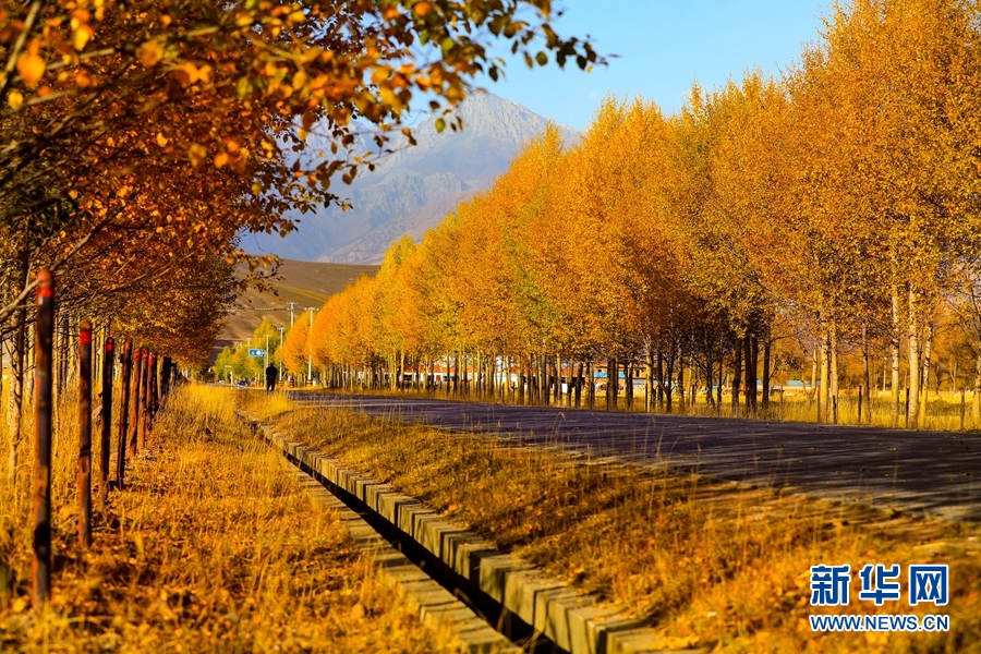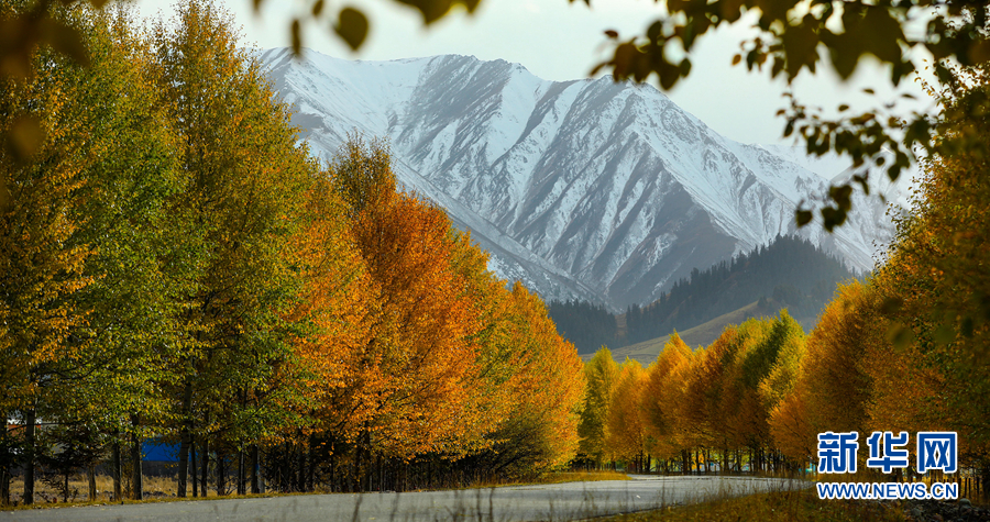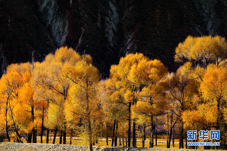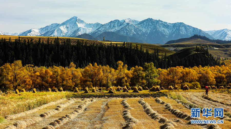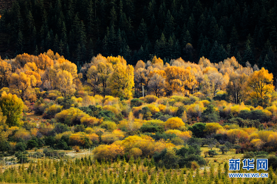 金黃色的樹木與遠山交相輝映,處處呈現出醉人的美景。新華網 蘇金元 攝