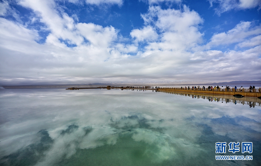 茶卡鹽湖水天一色,景色唯美。新華網(wǎng)發(fā)(宋忠勇攝)