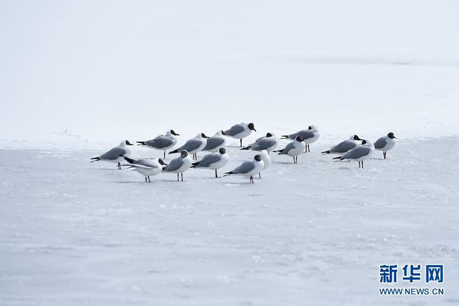 一群水鳥棲息在青海湖的冰面上。(資料圖)新華社記者 張龍 攝