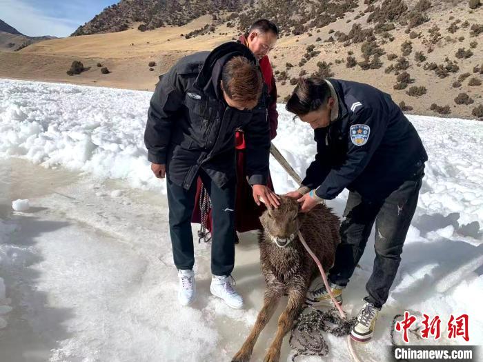 圖為生態(tài)保護(hù)人員營(yíng)救出一只白唇鹿。長(zhǎng)江源園區(qū)曲麻萊管理處 供圖