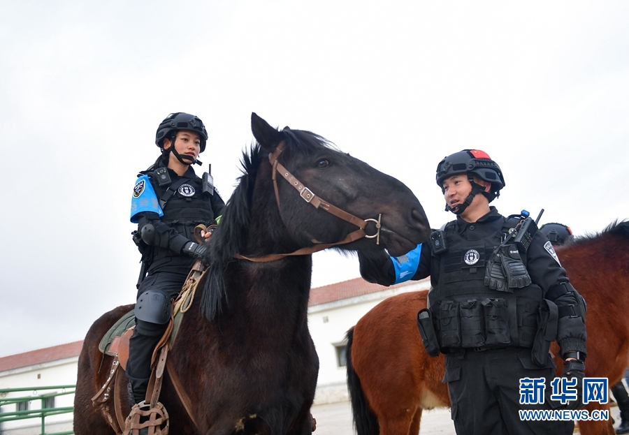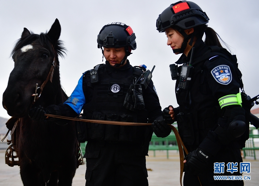 1月9日,青海省果洛藏族自治州公安局特警支隊(duì)直屬女子中隊(duì)的隊(duì)員在進(jìn)行騎馬執(zhí)勤訓(xùn)練。新華社記者 張龍 攝