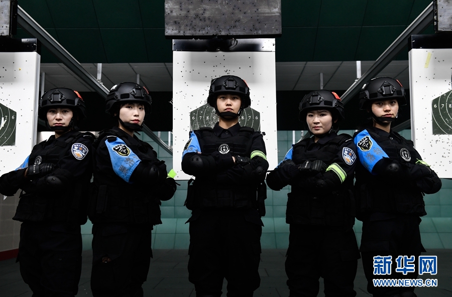 1月9日,青海省果洛藏族自治州公安局特警支隊(duì)直屬女子中隊(duì)的隊(duì)員在射擊訓(xùn)練館合影。新華社記者 張龍 攝