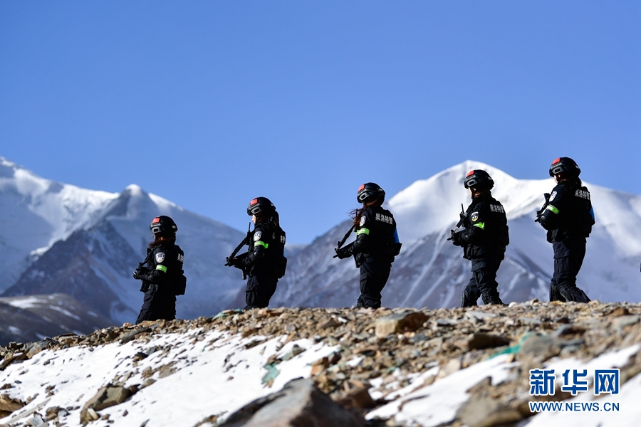 1月9日,青海省果洛藏族自治州公安局特警支隊(duì)直屬女子中隊(duì)的隊(duì)員們?cè)诎⒛岈斍渖侥_下參加高原野外適應(yīng)性訓(xùn)練。新華社記者 張龍 攝