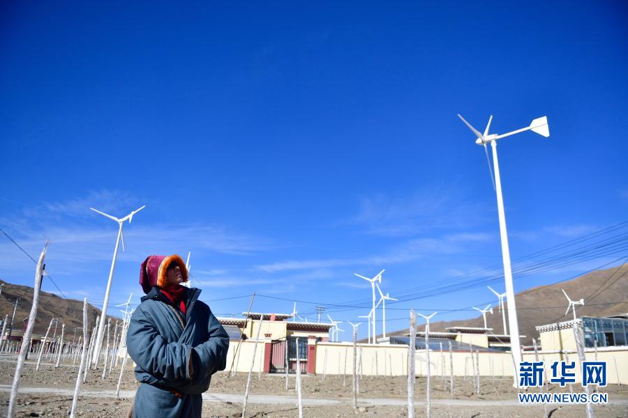 1月11日,隆亞村村支部書(shū)記貢保多杰在查看搬遷點(diǎn)的風(fēng)力發(fā)電機(jī)組運(yùn)行情況。新華社記者 張龍 攝