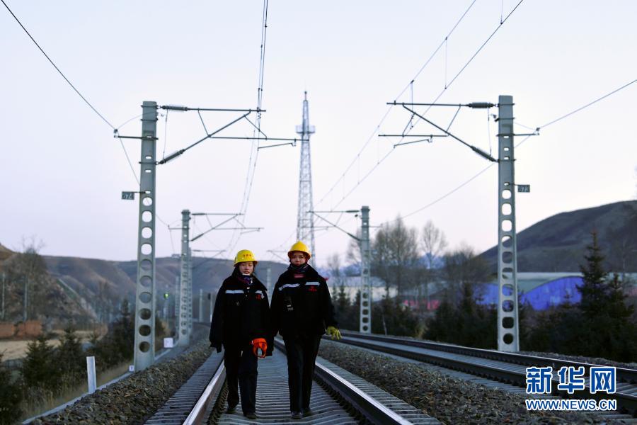 2月2日,在青藏鐵路公司西寧供電段哈爾蓋工區(qū)負責(zé)鐵路線上,郭勝強(左)與羅露露在巡檢接觸網(wǎng)。新華社記者 張龍 攝