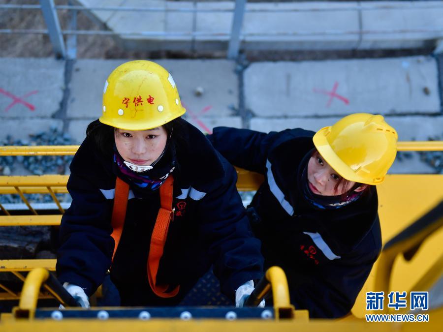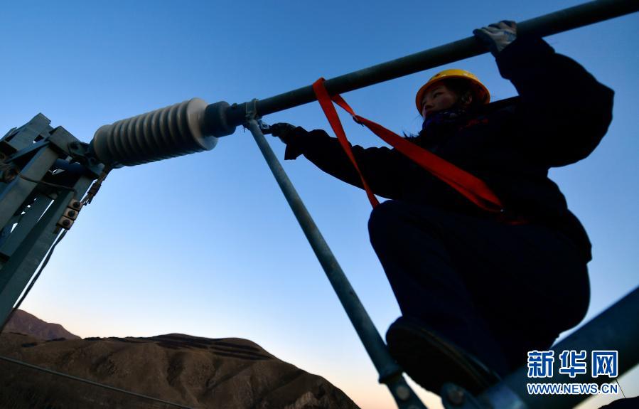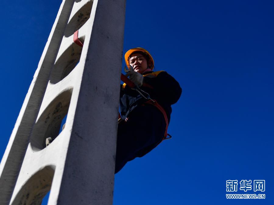 2月2日,在青藏鐵路公司西寧供電段哈爾蓋工區(qū)負責(zé)鐵路線上,羅露露在攀登接觸網(wǎng)支柱。新華社記者 張龍 攝