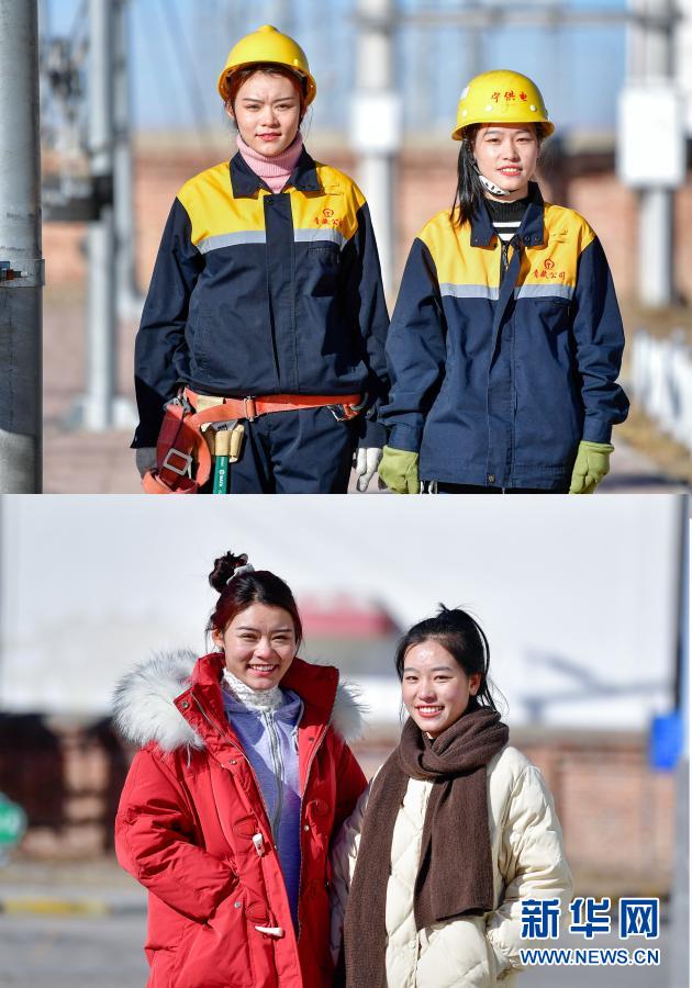 這是一張拼版照片,上圖為:羅露露(左)與郭勝強在工作前拍攝的合影(2月2日攝);下圖為:羅露露(左)與郭勝強在休息時拍攝的合影(2月2日攝)。新華社記者 張龍 攝