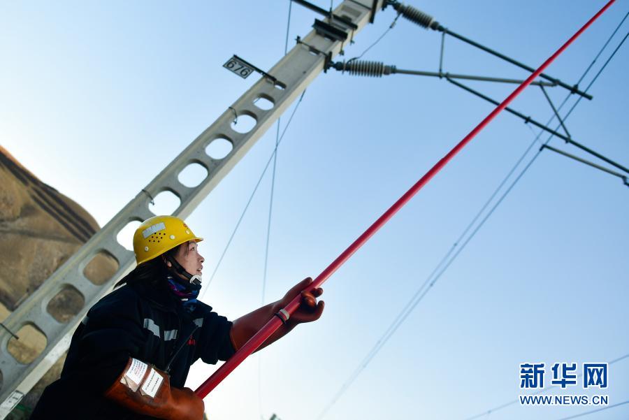2月2日,在青藏鐵路公司西寧供電段哈爾蓋工區(qū)負責(zé)鐵路線上,羅露露在檢修螺絲。新華社記者 張龍 攝