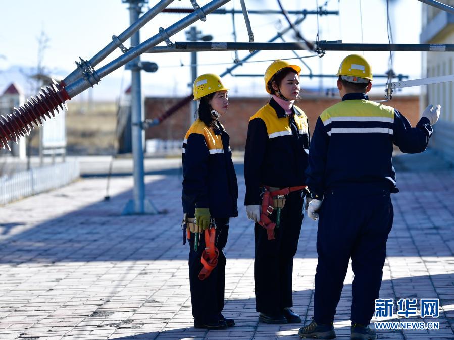 2月2日,在青藏鐵路公司西寧供電段哈爾蓋工區(qū),郭勝強(左)與羅露露(中)在聽老職工講解安全知識?!⌒氯A社記者 張龍 攝