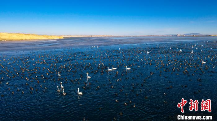 圖為上萬只野生鳥類在湖中游蕩。烏席勒 攝