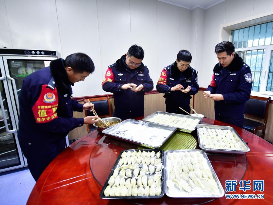 2月4日,沱沱河站派出所民警在包餃子。新華社記者 張龍 攝