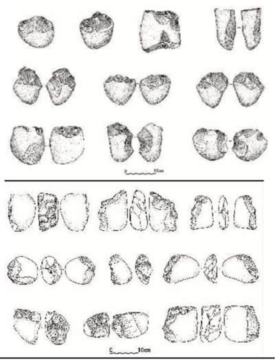 將塘達(dá)遺址石器(下圖)與井水灣遺址石制品比對(duì)發(fā)現(xiàn),塘達(dá)與井水灣遺址石器工業(yè)均就地取材,以遺址附近河灘礫石為主體原料,石核以雙面剝片和單面剝片模式為主,原料開發(fā)利用強(qiáng)度適中,不見盤狀石核等更為復(fù)雜和具有預(yù)制性的石核剝片模式。石制品尺寸較大,工具類型中存在典型的刮削器和砍砸器,不見手斧和手鎬等大型切割工具,均屬于東亞典型石核—石片石器工業(yè)。