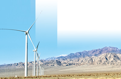 柴達(dá)木盆地上,巨大的風(fēng)力發(fā)電機(jī)正在運(yùn)轉(zhuǎn)。記者 姜峰 攝