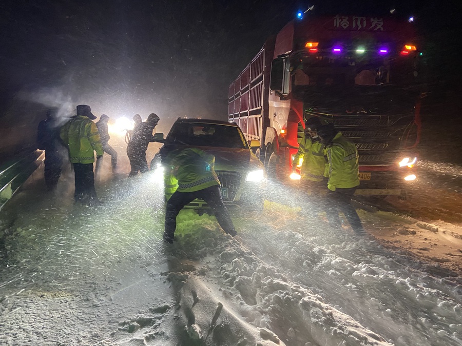在這次緩堵保暢工作中,瑪多縣公安局交警大隊(duì)副隊(duì)長李西帶領(lǐng)大隊(duì)所有民警、輔警趕到現(xiàn)場處理滯留車輛。由于這一路段為長大坡道、急彎路段,加之大風(fēng)將雪吹至路面,導(dǎo)致有60余輛車滯留。當(dāng)時(shí)最低氣溫為零下10℃,在海拔高度4542米的惡劣環(huán)境下,工作人員用凍僵的雙手為被困群眾保駕護(hù)航。