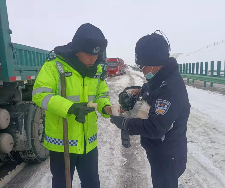 李西和同事們紛紛拿起鐵鍬將積雪鏟至道路兩邊,迅速開辟出一條臨時(shí)車道,讓車輛緩慢通行,這時(shí)他們已經(jīng)連續(xù)奮戰(zhàn)7個(gè)多小時(shí)。民警吃的是溫水泡的方便面,渴了就喝冰涼的礦泉水,或者直接抓一把雪塞到嘴里。累的實(shí)在不行就隨便找個(gè)能擋風(fēng)的地方睡一會(huì)。有時(shí)候遇到堵車,有些司乘人員沒有帶食物,大家還把自己的口糧分給他們,他們只能挨著餓。