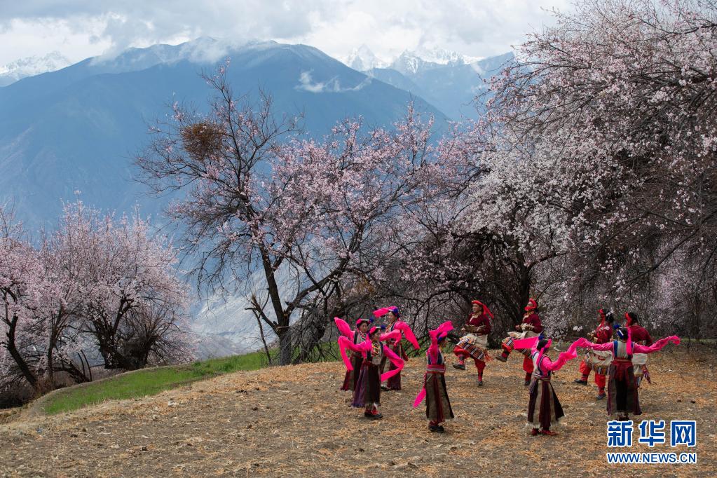 4月4日,在得榮縣徐龍鄉(xiāng)徐堆村,藏族群眾在桃花林下表演當地歌舞——覺央彈唱。新華社記者 江宏景 攝