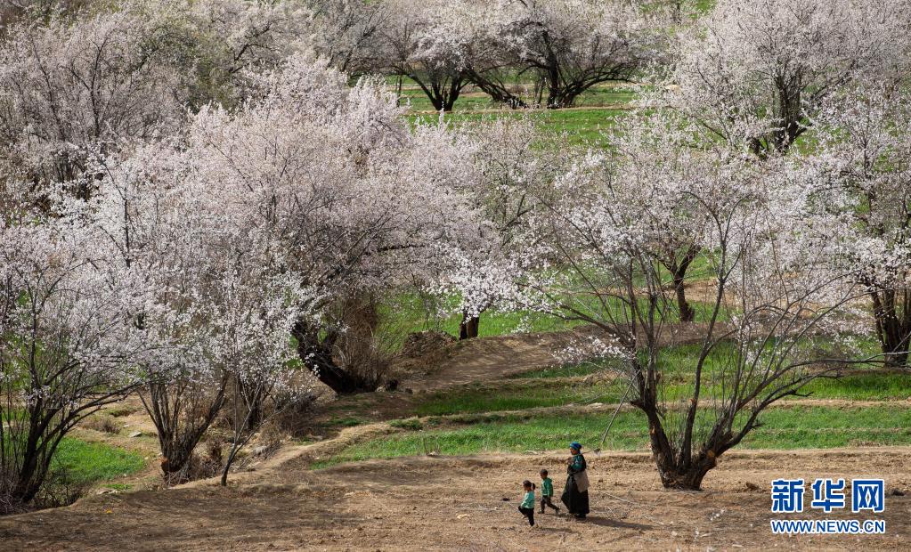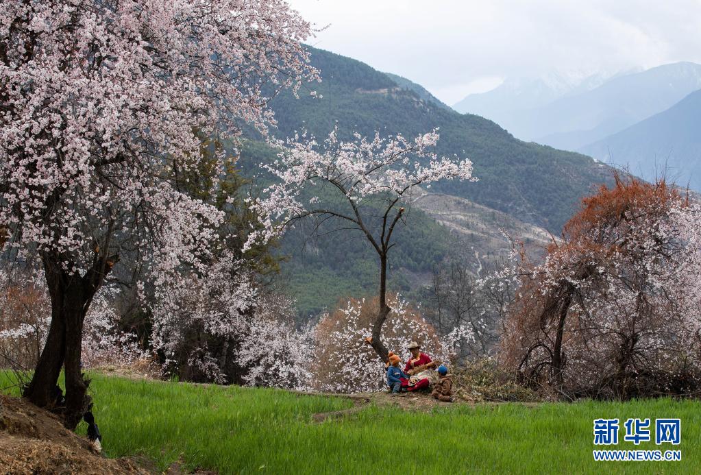 4月3日,一位藏族阿媽帶著兩個孫兒走在白松鎮(zhèn)日當村桃花林下。新華社記者 江宏景 攝