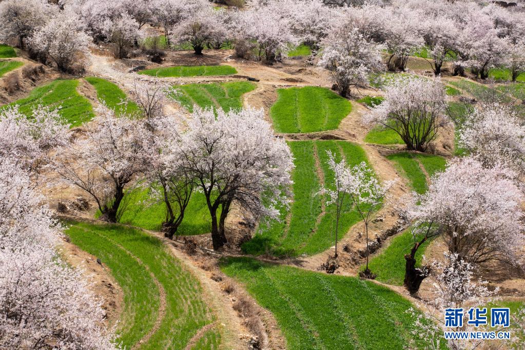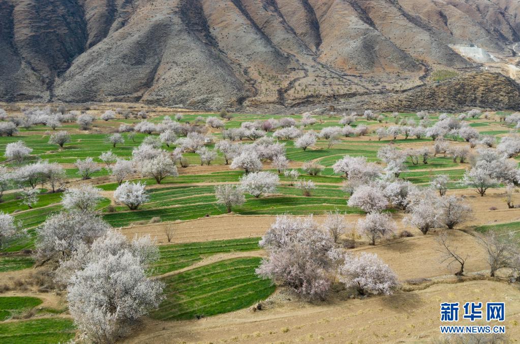 近日,四川省甘孜藏族自治州得榮縣境內成片的野生桃花從河谷到山腰次第開放,漫山遍野的桃花與雪山、麥地、白藏房等構成高原上美麗的“世外桃園”畫卷。