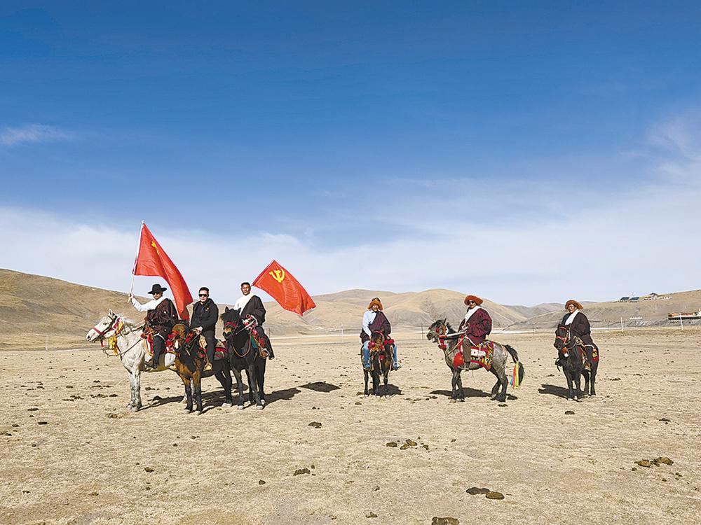 在玉樹藏族自治州曲麻萊縣葉格鄉(xiāng)龍麻村,一陣馬蹄聲由遠(yuǎn)而近,牧民江措趕忙放下手中的活從帳篷里探出頭來,定睛一看,幾個(gè)熟悉的身影進(jìn)入視線。走在最前面的干部手拿一面鮮紅的黨旗隨風(fēng)飄動,江措激動地向大家打起了招呼。