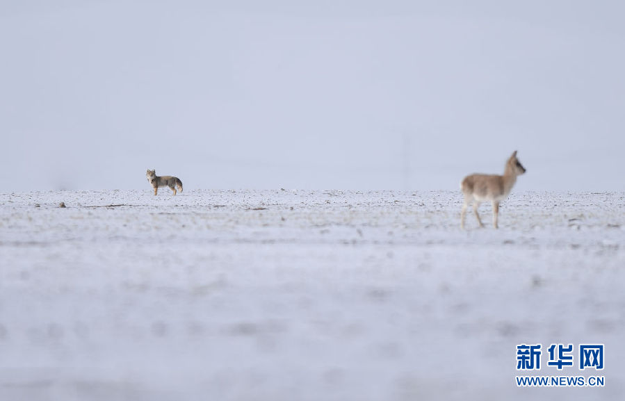 在可可西里地區(qū)拍攝的一只狐貍(左)和一只遷徙途中的藏羚羊(4月20日攝)。新華社記者 吳剛 攝