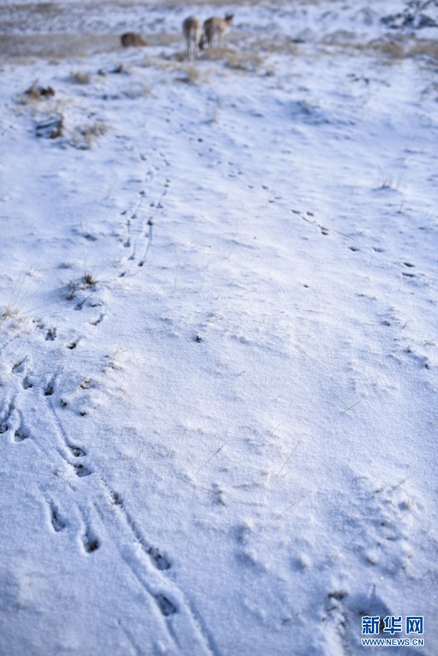 4月20日,一群遷徙藏羚羊在雪地上留下腳印。新華社記者 吳剛 攝