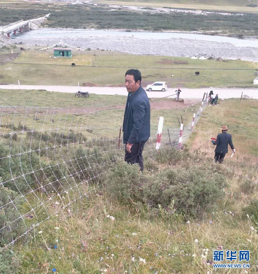 圖為護(hù)林員在清理草叢中的垃圾。(圖片由瑪沁縣東傾溝鄉(xiāng)政府提供)