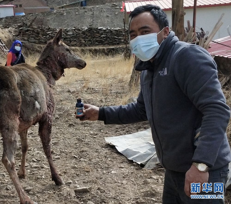 圖為護(hù)林員給救助的馬鹿上藥。(圖片由瑪沁縣東傾溝鄉(xiāng)政府提供)