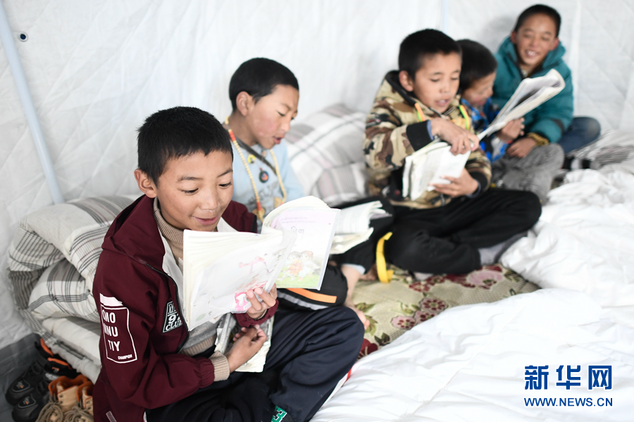 5月22日,在瑪多縣黃河鄉(xiāng)寄宿制學(xué)校救災(zāi)安置點,孩子們在讀書。新華社記者 薛玉斌 攝