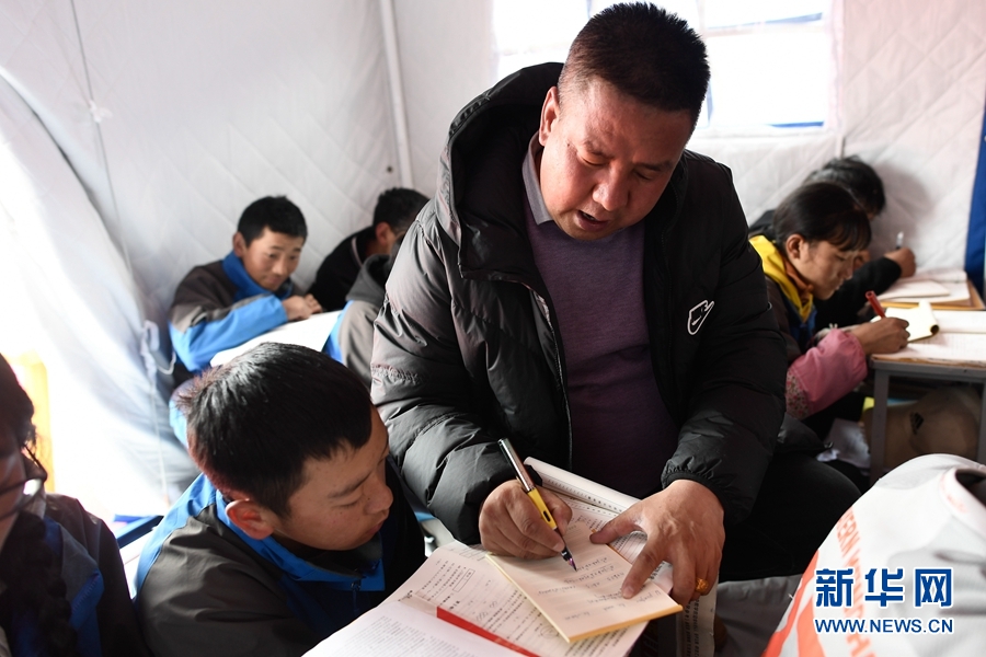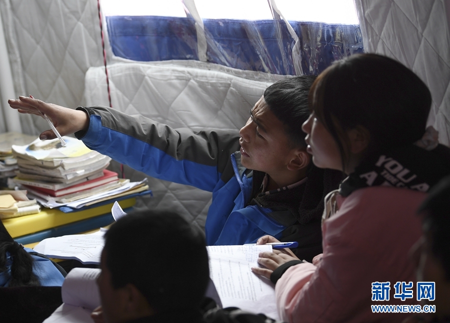5月23日,瑪多縣民族寄宿制中學(xué)九年級老師李加才仁在課堂上輔導(dǎo)學(xué)生。新華社記者 張龍 攝