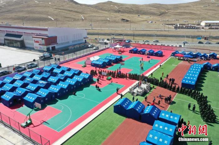 5月24日,瑪多縣民族寄宿制中學(xué)的師生們參加升旗儀式。當(dāng)日,青海省果洛藏族自治州瑪多縣學(xué)生復(fù)課。(無人機照片) 中新社記者 馬銘言 攝