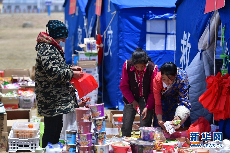 為穩(wěn)定市場秩序,方便居民生活,瑪多縣市場監(jiān)督管理局從5月23日開始,搭建臨時帳篷市場,服務(wù)群眾。5月26日,兩名受災(zāi)群眾在瑪查理鎮(zhèn)安置點的帳篷超市選購商品。